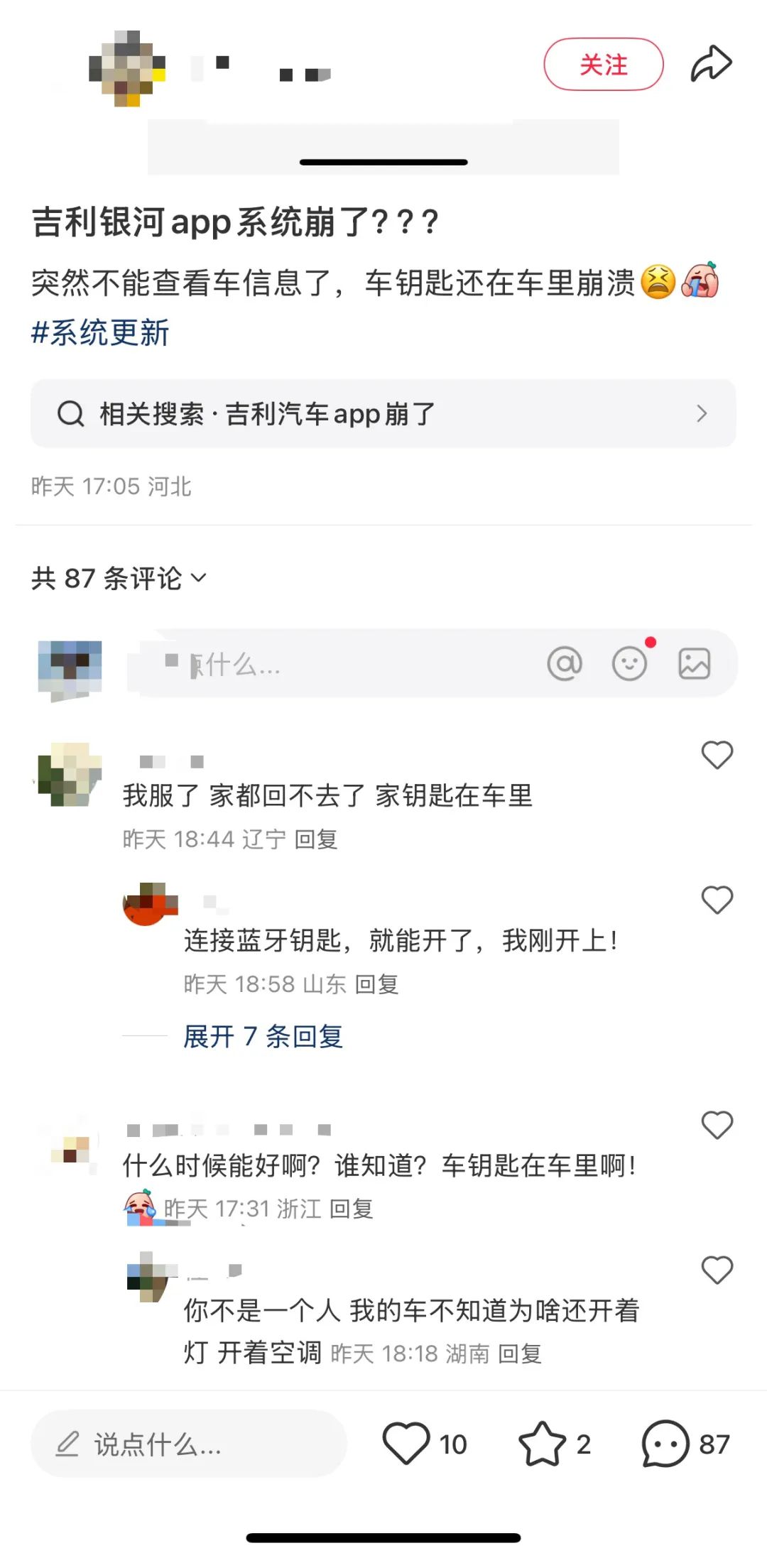 随后,“吉利银河App崩溃”话题登上微博汽车类热搜,车主不满情绪集中爆发。