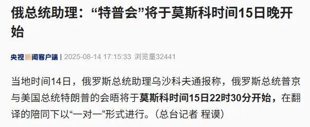 当地时间14日,俄罗斯总统助理乌沙科夫通报称,俄罗斯总统普京与美国总统特朗普的会晤将于莫斯科时间15日22时30分开始,在翻译的陪同下以“一对一”形式进行。乌沙科夫还表示,俄美元首将在会谈后举行联合新闻发布会。美国总统特朗普与俄罗斯总统普京将于15日在美国阿拉斯加州最大城市安克雷奇举行会晤。