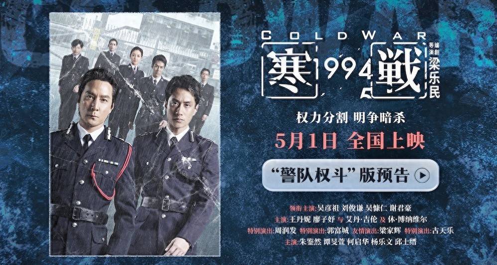 电影《寒战1994》由江志强、陈祉希、柯利明、傅若清担任出品人,由江志强、何韵明、梁乐民、陈祉希、李现曾监制,梁乐民导演及编剧,张飞帆、何亮瑜、张戬仁编剧,吴彦祖、刘俊谦、吴慷仁、谢君豪领衔主演,王丹妮、廖子妤与艾丹·吉伦及休·博纳维尔主演,周润发、郭富城特别演出,梁家辉友情演出,古天乐特别演出。由无锡加雄影业有限公司、万达影视传媒有限公司、安乐影片有限公司、上海儒意影视制作有限公司、中国电影产业集团股份有限公司、安乐(北京)电影发行有限公司出品,之江电影集团有限公司、北京微梦创科网络技术有限公司联合出品,将于5月1日正式上映,敬请期待!
